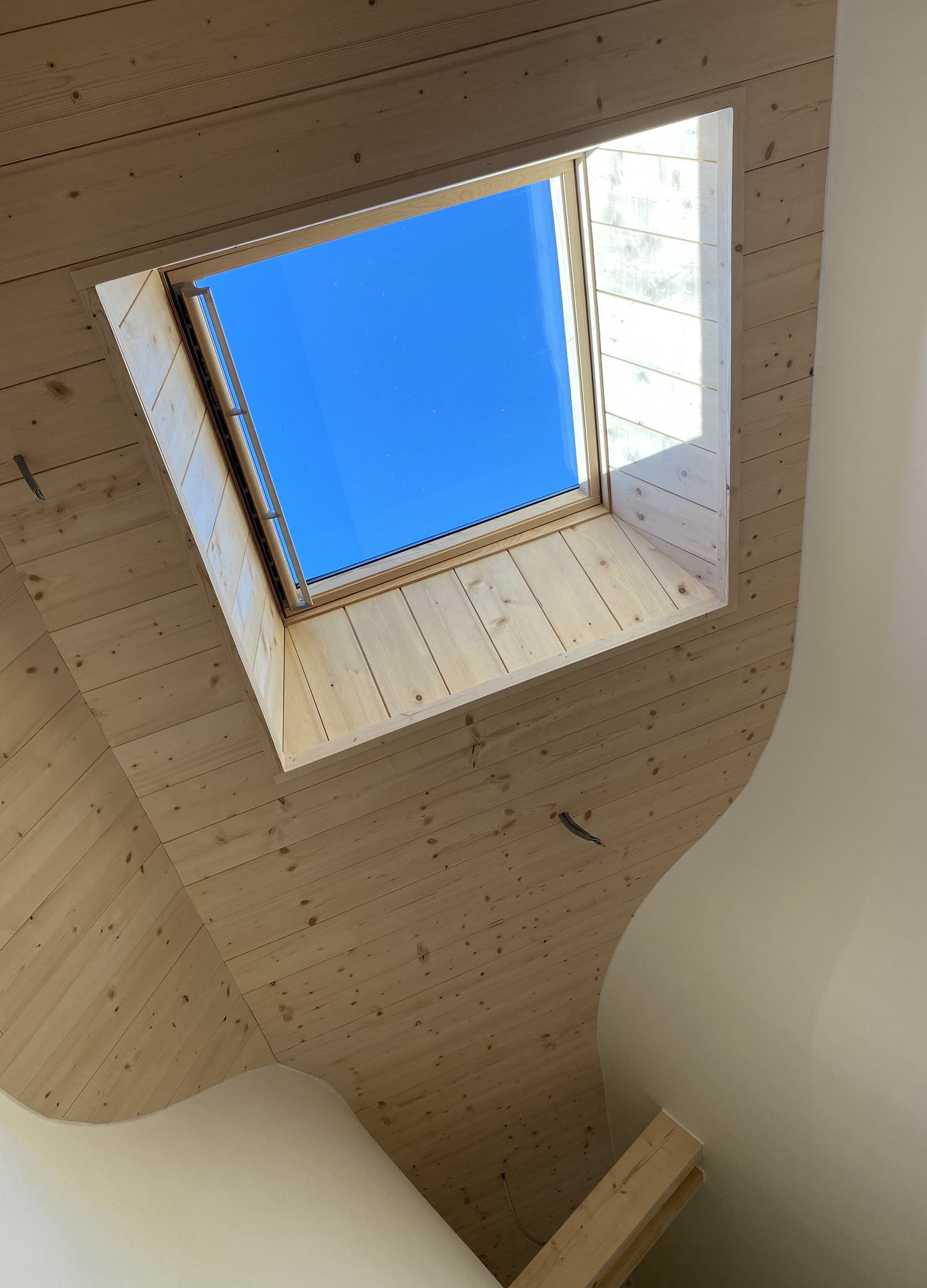 La matière, elle aussi, raconte cette dualité. À l’extérieur, le bois brûlé, technique locale (brulé brossé) poussée à la manière japonaise pour le projet, porte la mémoire du feu et la rudesse caractéristique du site. À l’intérieur, les courbes se déploient, accrochent la lumière en dirigeant la main. Là où le dehors absorbe, le dedans rayonne. Entre matière physique et matière intangible, le projet construit un dialogue sensible : celui du refuge austère qui accueille avec douceur.
