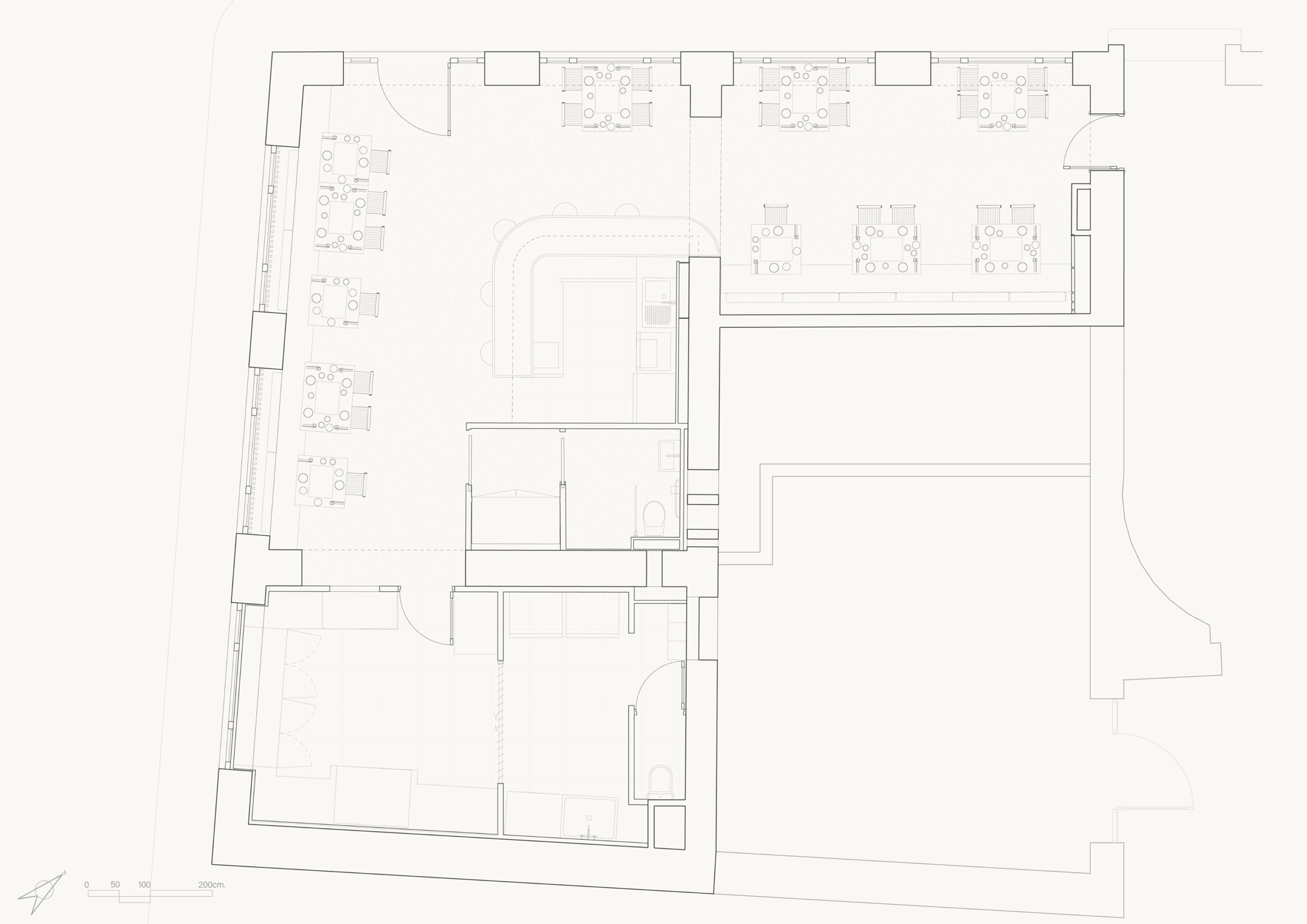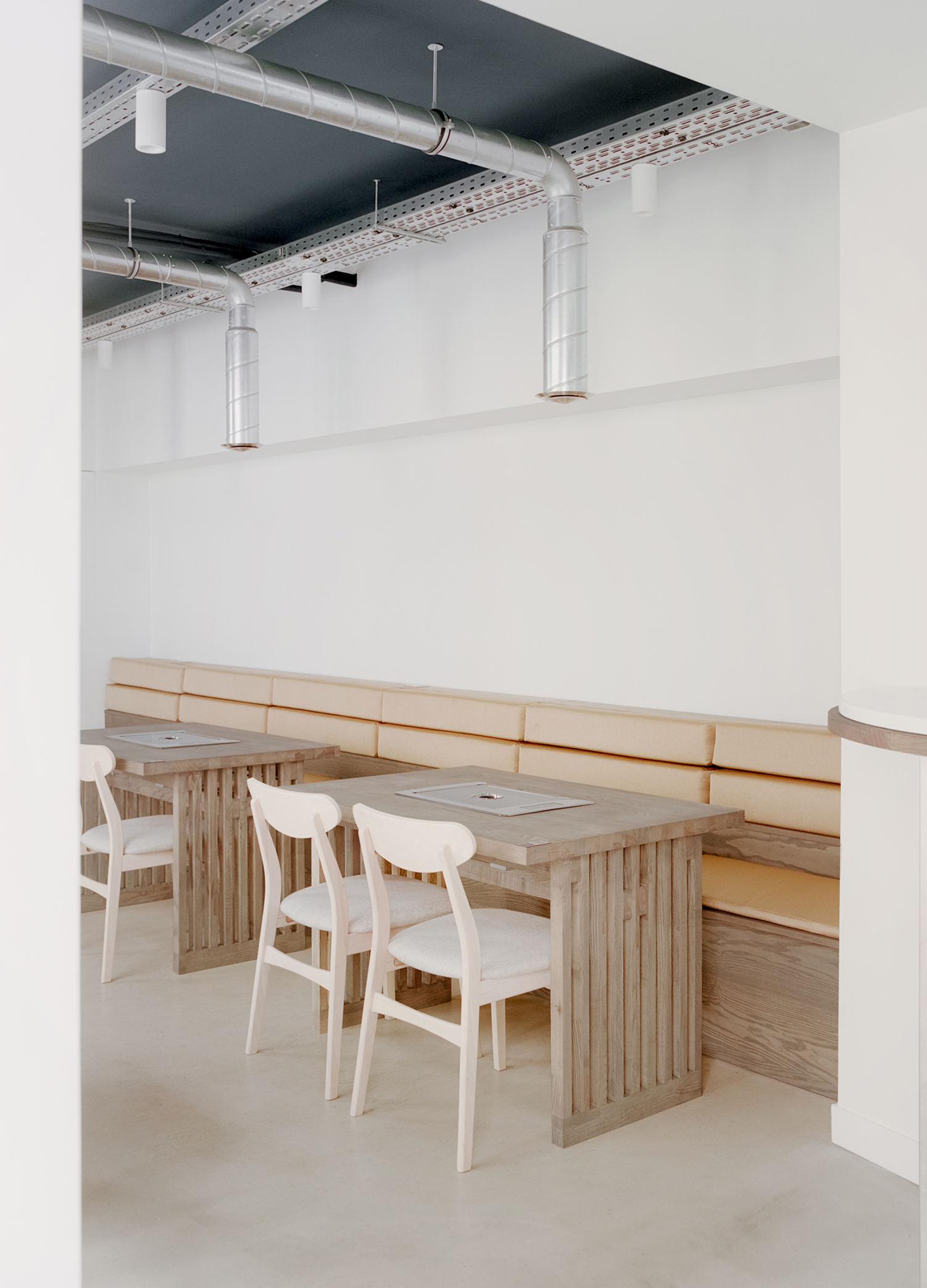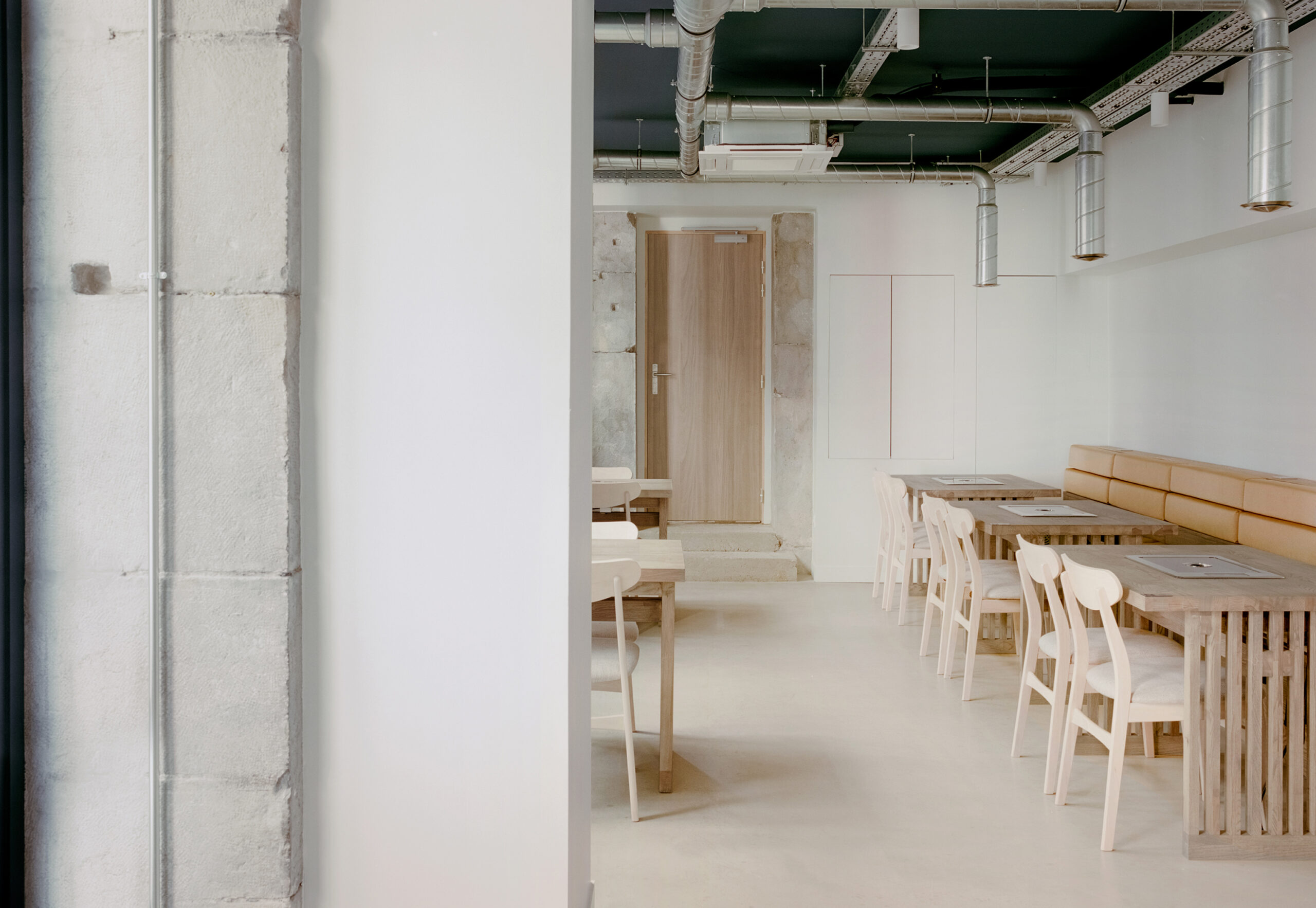 Le restaurant Youjung s’inscrit dans un bâtiment au caractère patrimonial du quartier des Antiquaires à Grenoble, où la tradition constructive, piliers de pierre et voûtes anciennes, dialogue avec une pratique culinaire interactive et contemporaine : la cuisson autonome sur barbecues coréens. Ce dispositif, intégré à chaque table, engage le convive dans une expérience sensorielle et collective. La principale contrainte technique, liée à l’évacuation des fumées et des graisses dans un espace de dégustation, devient l’élément fondateur du projet architectural.