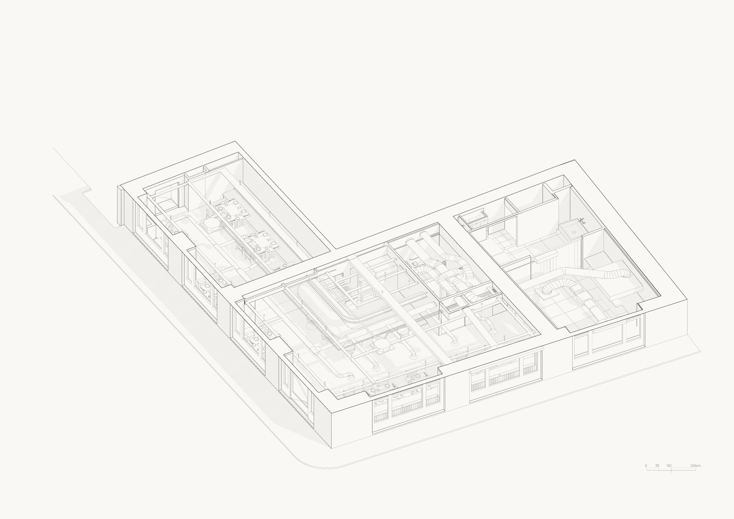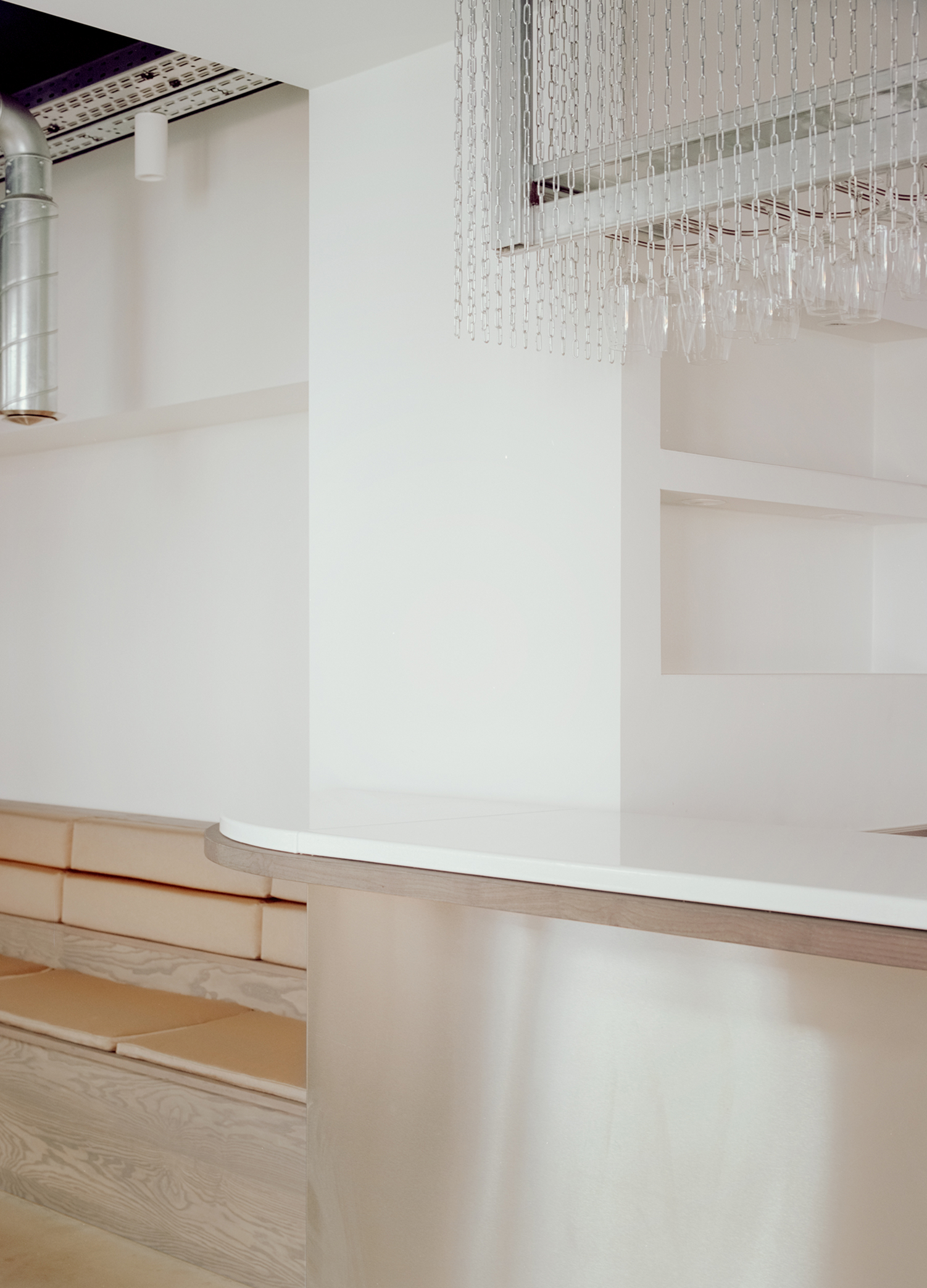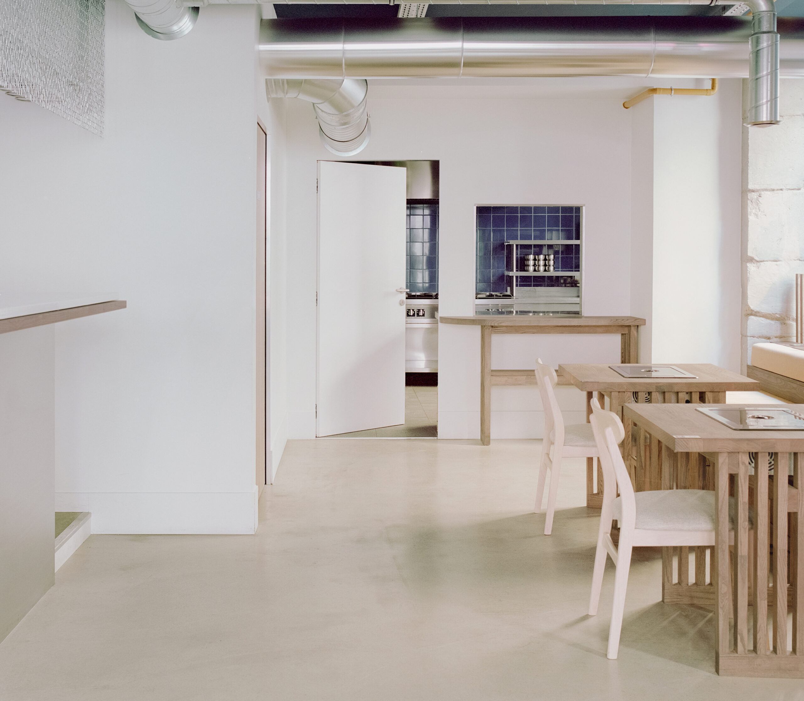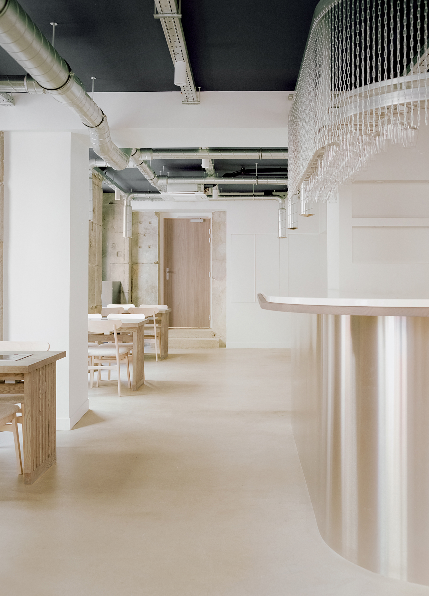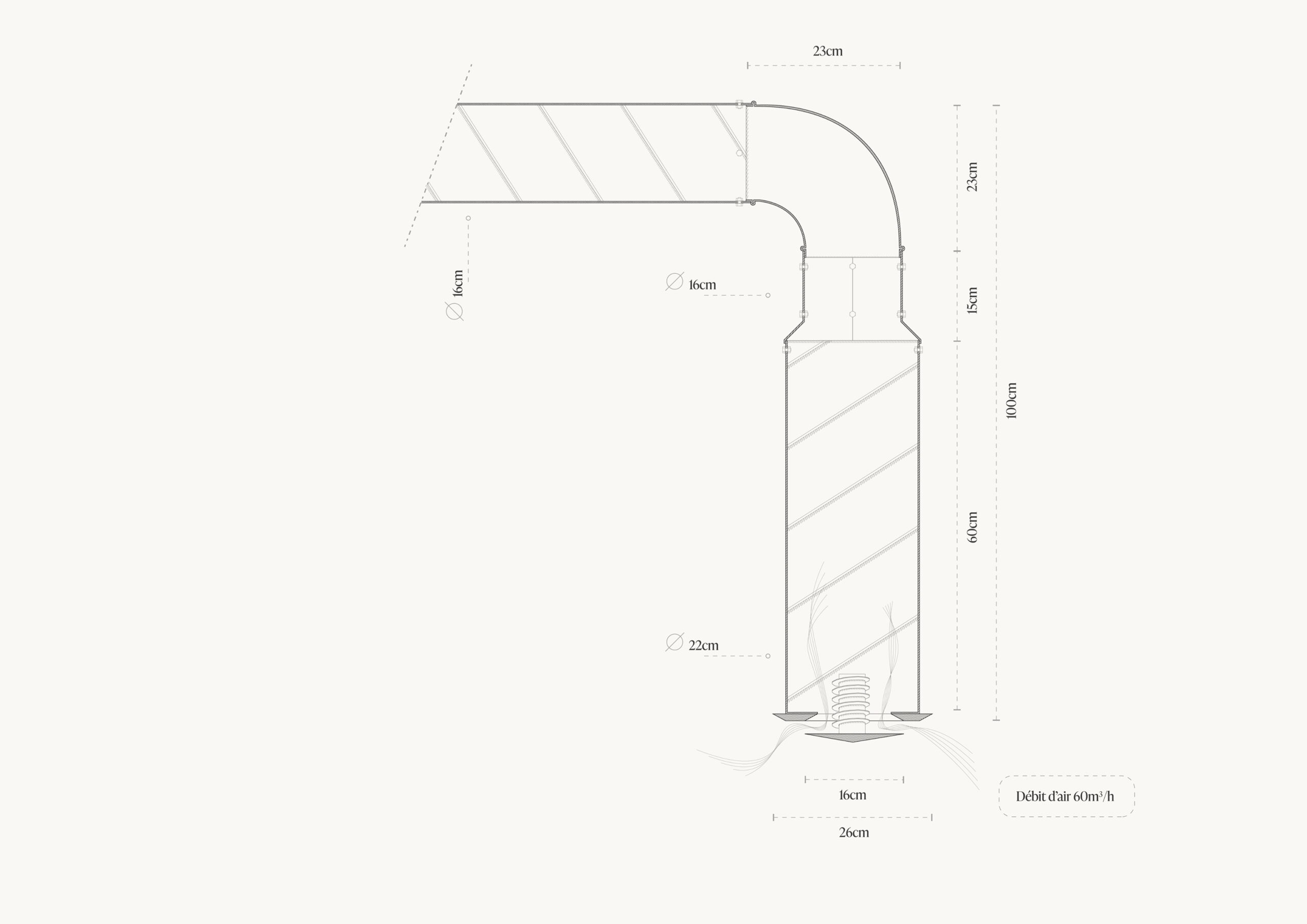 L’épure et la mise en valeur de chaque composant guident la conception. Les réseaux de ventilation, au lieu d’être dissimulés, sont révélés et mis en scène : les bouches d’évacuation se transforment en objets suspendus, à mi-chemin entre élément technique et lanterne lumineuse. Cette approche, fruit d’un travail conjoint avec le bureau d’études fluides et le fabricant, traduit la recherche d’un équilibre entre performance, précision et délicatesse. Le projet fait de la contrainte une opportunité poétique, où la technique devient esthétique et la fonction, visible, participe pleinement à l’identité du lieu.