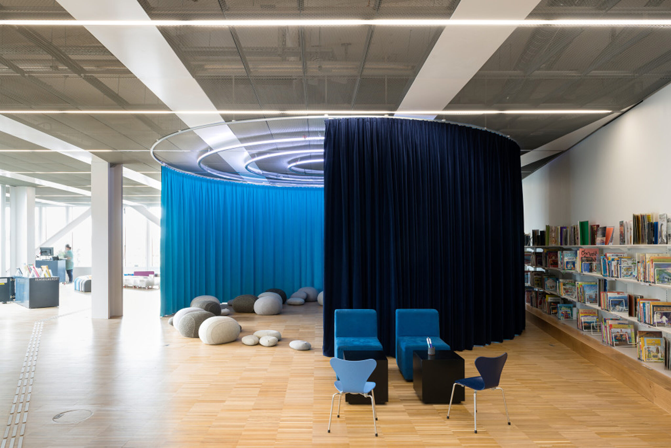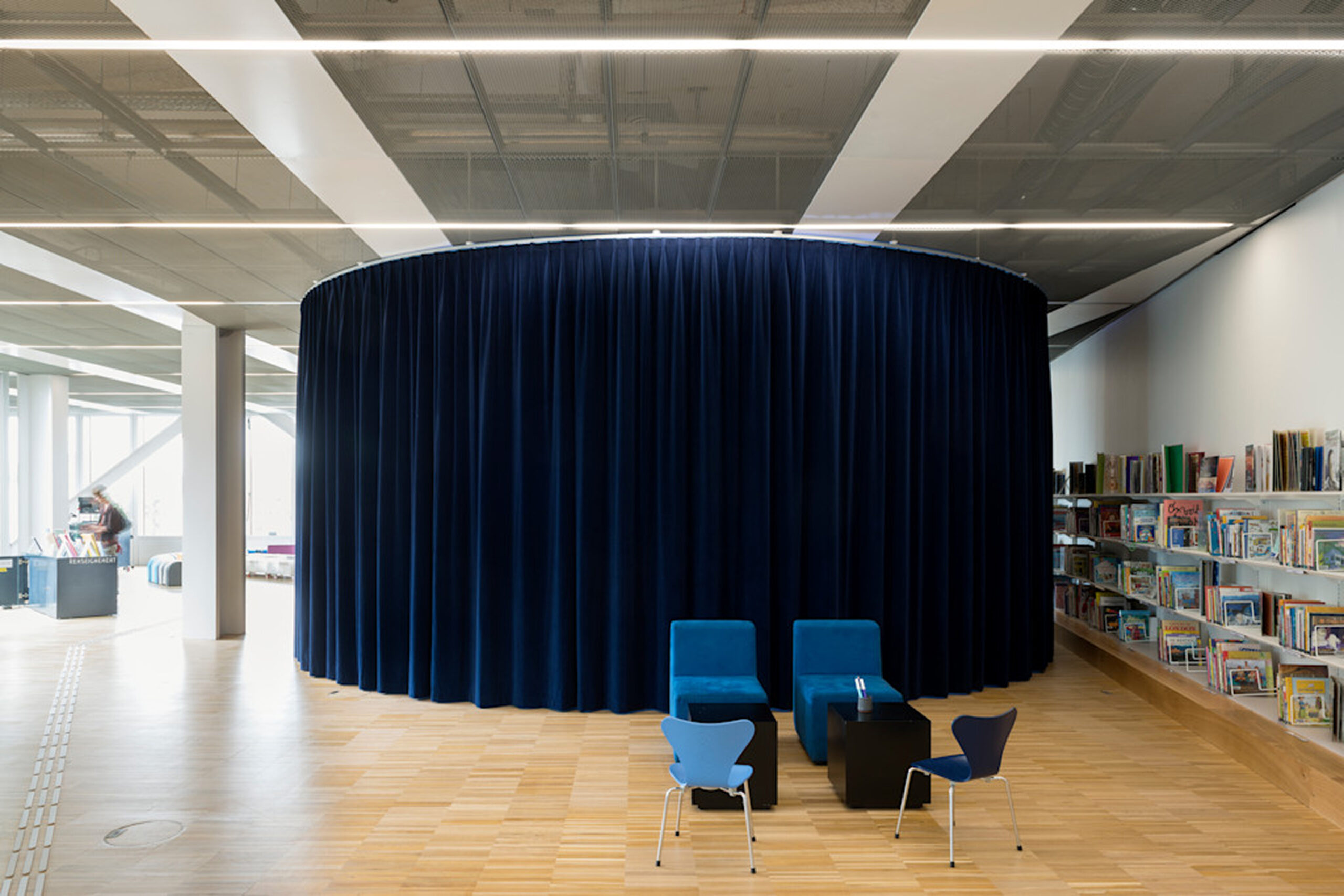 L’heure du conte s’inscrit dans un espace dédié, au dernier étage de la BMVR de Caen, bâtiment dessiné par l’agence OMA. C’est un lieu dans le lieu, un espace qui, lorsque le rideau se ferme, permet la lecture d’un conte aux enfants, et les transporte hors du temps.